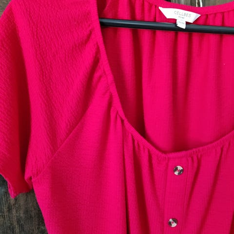Punainen T-paita Cellbes, koko 36/38. Helmassa solmimisnauhat. Takapituus 78 cm. Kainalo-kainalo ympärysmitta 108 - 128 cm. 100 % pv. Uusi, käyttämätön. Postimaksu 8,90e.