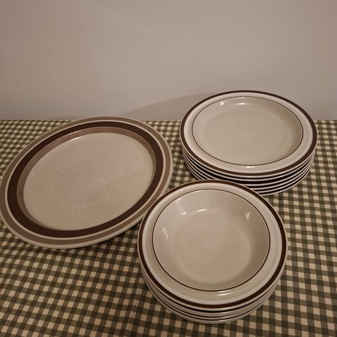 Michael Schilkinin Arabian taideosastolla suunnitteleman aamiaissarjan leipälautaset. Lautasten kunto on muuten todella hyvä, mutta yhdessä lautasessa on kuvassakin näkyvä lohkeama. Toisen lautasen lasitteessa on ylimääräinen roska (tullut tuotantovaiheessa) ja yhdessä lautasessa on keskellä lasitteessa naarmu. Näistä kaikista on kolme viimeistä kuvaa.