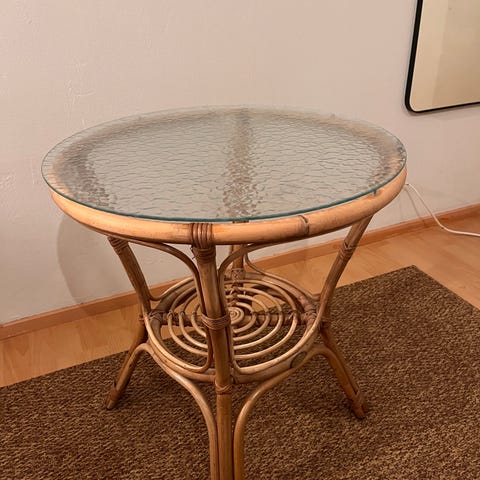 Kaunis rottinkinen lasipöytä. Kunto hyvä, pieni särö yhdessä kulmassa ja pieniä naarmuja. Syvyys 70, leveys 110 ja korkeus 45 (ostettu joskus Papagenasta).