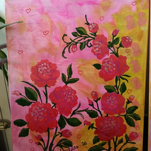 Tuntemattoman taiteilijan työ, jolla on ollut pensseli ja taito hallussaan. Amaryllis hehkuu aidon amarylliksen hohtoa, todella aidon näköinen.