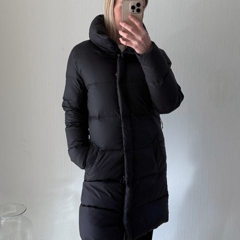 Filippa K:n pitkä bomber-talvitakki. Etutaskuissa piilonepparit, hihatasku, kiristysnauha helmassa.