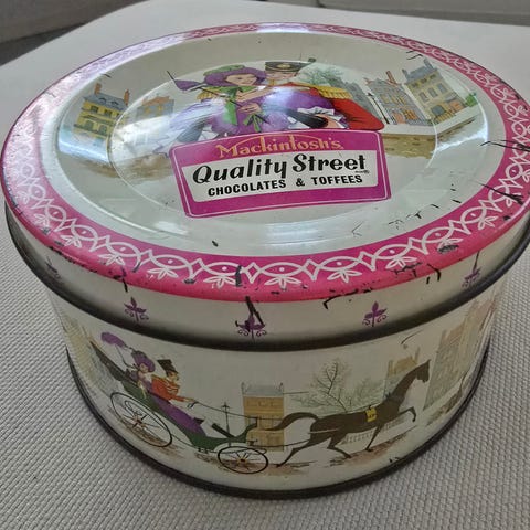 hakutunnisteet: metallinen, purkki, sisustus, rasia, suklaa, toffee, mackintosh's, Quality Street, Made in the United Kingdom, England, retro