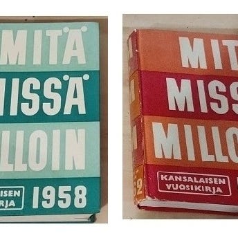 Myydään mitä missä milloin kirjoja. Kirjat ehjät.Jäljellä 2 kpl 1953 ja 1958. Hinta 2 e/ kpl, Postitus onnistuu.