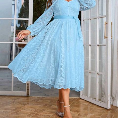 Kaunis pitkähihainen turkoosi pitsimekko. Uudenveroinen. Hihassa tahra, jota en ole yrittänyt poistaa. Koko 44.