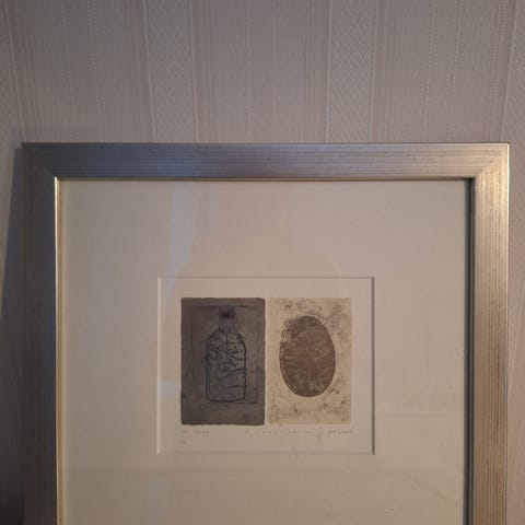 Teoksen koko 17 x 17 cm. Taulun koko kokonaisuudessaan 44 x 44 cm. Ehjä, siisti ja uudenveroinen.