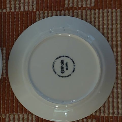 4 kahvimukia, 4 isoa matalaa lautasta (halkasija 23cm) ja 1 pienempi matala lautanen (halkasija noin 21,5cm).