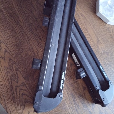 Kuva 3 suksitelineet vesikourulliseen autoon, ei avainlukitusta vaikka lukot on, merkki thule h.15 euroa