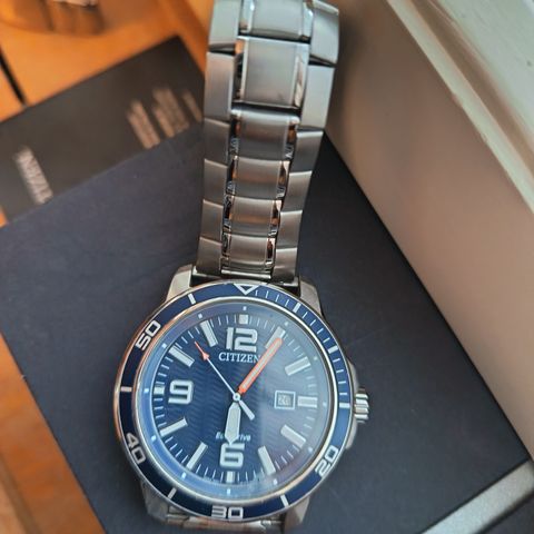 Hieman käytön jälkeä rannekkeessa, mutta muutoin hyvin puhdas ja toimii mahtavasti. Koska kyseessä on Eco-Drive-rannekello, siihen ei tarvitse vaihtaa paristoa eikä sitä tarvitse vetää, koska se latautuu jatkuvasti valon avulla. Toimii niin auringonvalolla kuin ihan lampun valollakin.