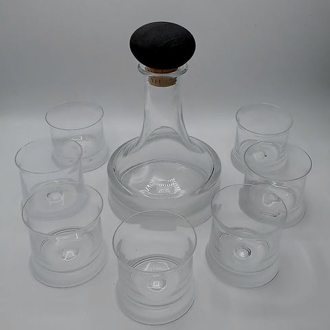 Kaadin korkeus 16cm, lasit 5 kpl korkeus 8cm, väri kirkas. Täysin ehjiä. Lasit alkuperäisessä pakkauksessa. Design Tapio Wirkkala.