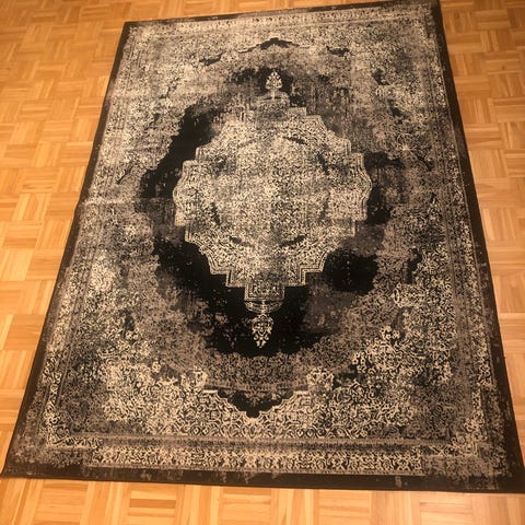 Mustavalkoraidallinen puuvillamatto, jonka päädyt on käännetty eli hapsut eivät ole näkyvissä. Yläpinnan (näkyvän puolen) värit ovat kirkkaat.