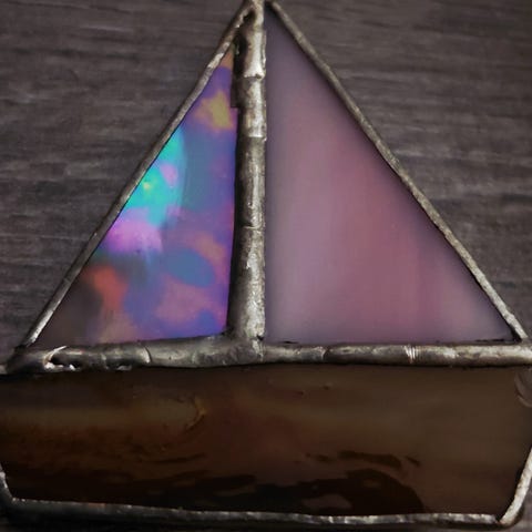 Tiffany rintakoru. Purjeveneen korkeus 5 cm ja leveys leveimmältä kohdalta 3,5 cm. Koru on käyttämätön.