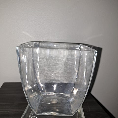 Orkidearuukku on kirkasta lasia ja se on noin 13 cm kanttiinsa ja korkeus noin 14 cm. Aluslautanen on myös lasia.