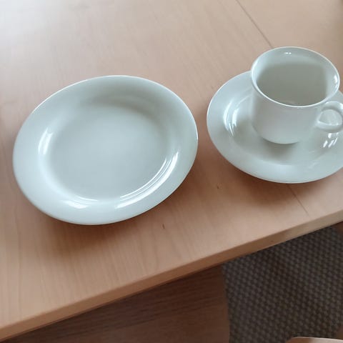 2 kpl pientä kahvinkuppia ja lautaset + 3 ylimääräistä lautasta. Kupin kork. n. 6,5 cm, halk. n. 7 cm ja tassin halk. n. 14 cm. Astiat lähes uudenveroisia. Yhteishinta 12 e.