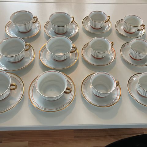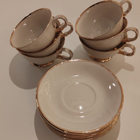 Myydään 6 kpl k. 4,5 cm h. 6,7 cm hyväkuntoiset Arabia Raitakulta mokkakupit aluslautasilla. Kuvan kannu, josta puuttuu kansi, tulee kaupanpäälle.