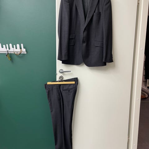 Miesten tummanharmaa puku. Merkki Oliver koko 54 (pitkä-hoikka). Housut pituus 116 cm, vyötärö 82 cm ja lahkeen suu 22 cm. Takki hartian leveys 50 cm, vyötärön kohdalta ympärysmitta 104 cm, pituus niskan kohdalta 82 cm ja hihan pituus 62 cm. Puku on pesetetty.