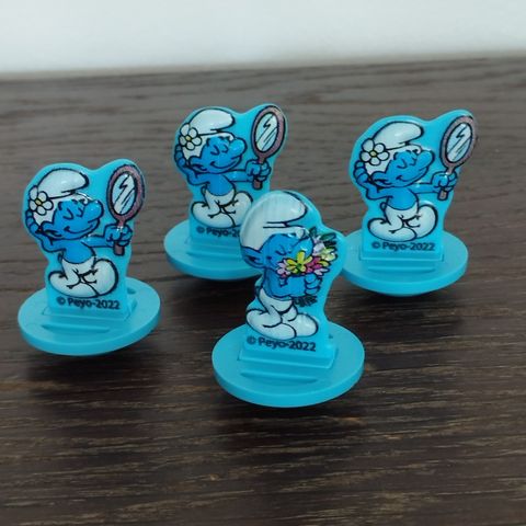 Kolme pientä Smurffihahmoa Kinder suklaamunasta. Keskimmäisellä hahmolla on ollut jonkinlainen alusta, mutta pysyy pystyssä myös ilman sitä. Hinta yhteensä 1,50 eur.
