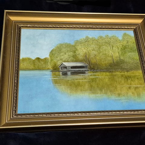 Kaunis taulu jossa on kuva kalastajatorpasta jonka vieressä kasvaa upea runkoinen puu.