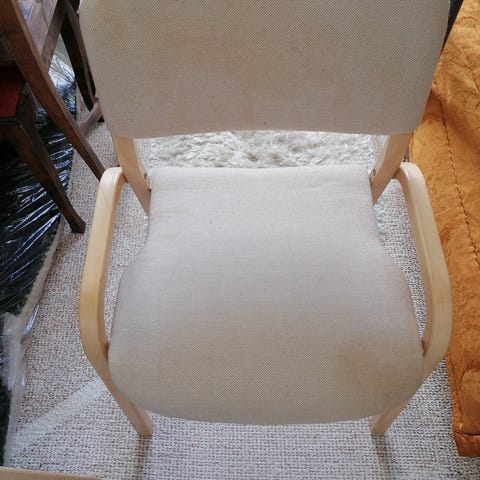 Tuoleja 2kpl. Kankaat maalannut ja verhoillut Tuija Vihermaa. Selkänojan korkeus 98cm. Istuinkorkeus 45cm. Istuimen leveys 40cm. 20eur/kpl.
