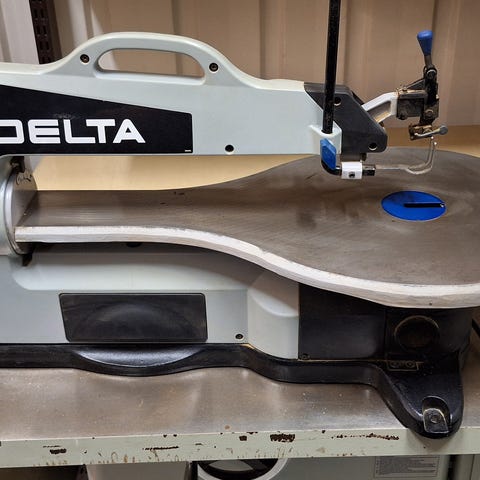 Vaihtuvanopeuksinen vannesaha, kallistuva pöytäaso, tukeva jalusta, purupuhallin, paljon teriä