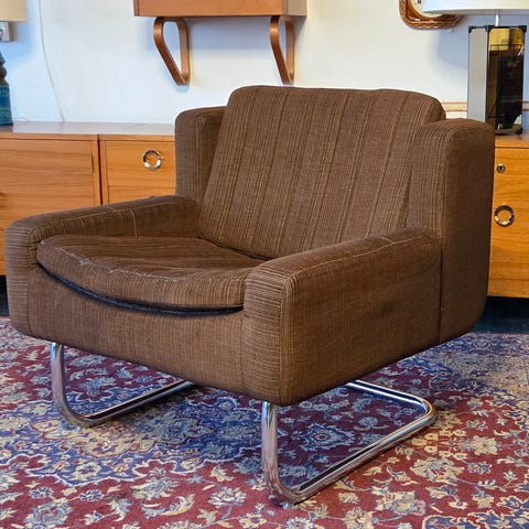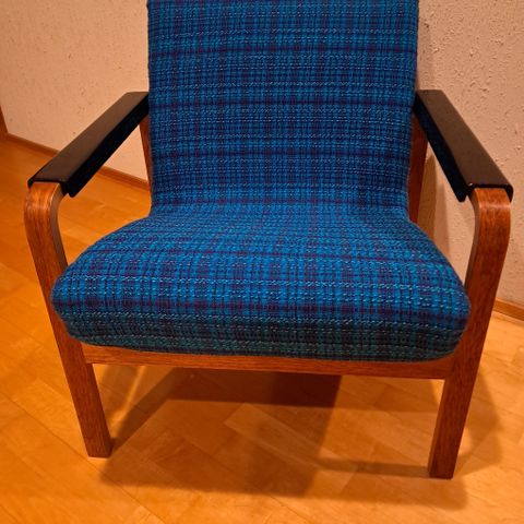 Tyylikäs kotimainen Trio raita nojatuoli myytävänä. Design by Hannu Peltonen, Lahden Puutyö. Rakenne kaikin puolin kunnossa. Verhoilut siistit. Istuimessa nukkaumaa takaosassa. Puuosissa ja maalissa muutamia kolhuja ja kuluneisuutta. Yleisilme edelleen edustava. Väri musta / harmaa.