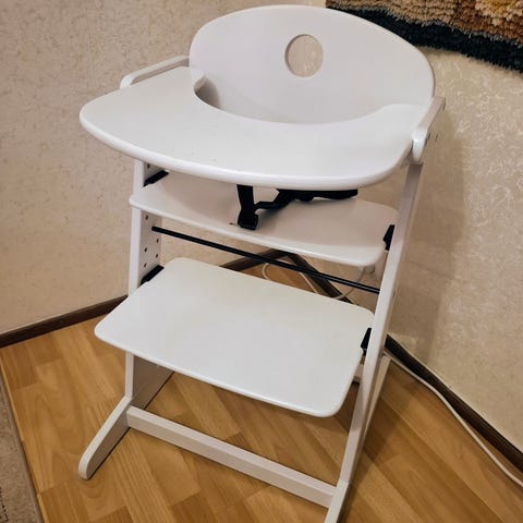 Myydään ihanan pirteän keltainen ja valkoinen retro syöttötuoli.