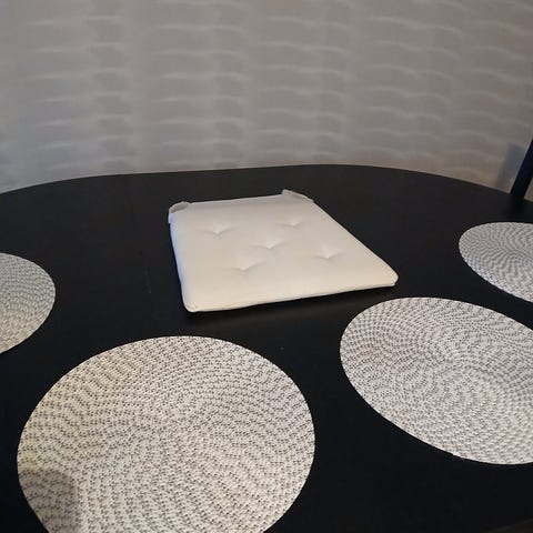 Reilun vuoden vanha ruokaryhmä, jossa vankka pöytä ja neljä tuolia.