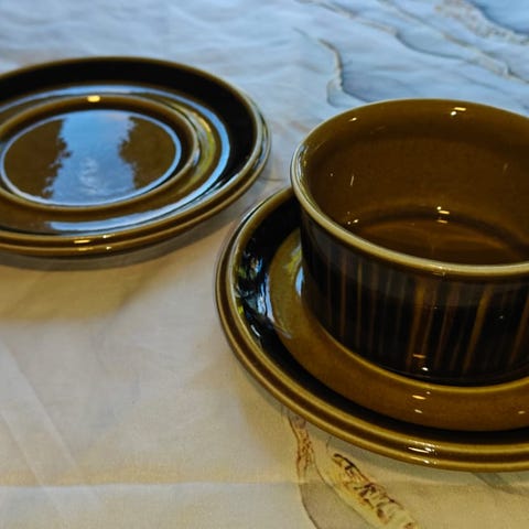 Kahvikupit 5 kpl ,lautaset 5kpl ja pullalautaset 5kpl . Teekuppeja 5 kpl ja lautaset 5 kpl. Väri Ruskea.
