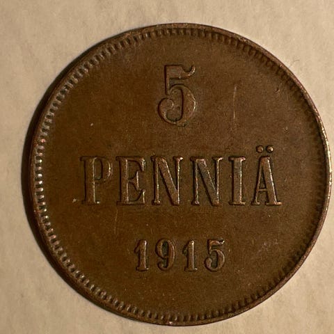 Myynnissä vanha 5 penninen vuodelta 1915.