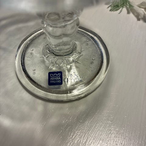 Arabia Finland Finn Crystal- tarralapulla olevat 2 kpl jalallisia Apila - jälkiruokamaljoja. Korkeus 10 cm ja halkaisija suuaukolta 10,5 cm. On säilytetty vain koristeena vitriinissä, eivät ole koskaan olleet käytössä! Yhteishinta 18 euroa.
