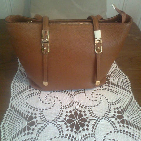 Konjakin ruskea käsi/olkalaukku. Aitoa nahkaa. Mitat: 29 x 20 x 7,5cm. Irroitettavan olkahihnan pituus yhteensä 80cm. Pakettiautomaatti 8.90e MMM