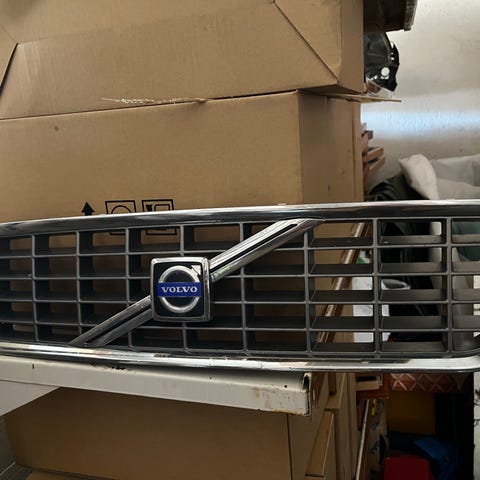 Volvon alkuperäinen etumaski/säleikkö. Hyvä kuntoinen, merkki vähän ottanut kiveniskuja.