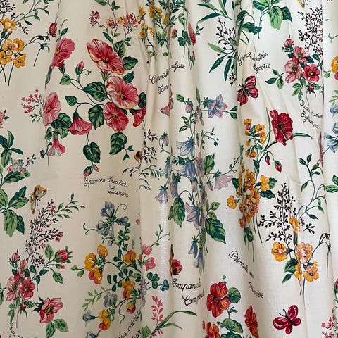 Sinililja verhot 2 kpl. Leveys 148 ja pituus 243cm. Ohut kangas, joka laskeutuu hyvin eikä rypisty. Luonnonvalkoinen pohja.