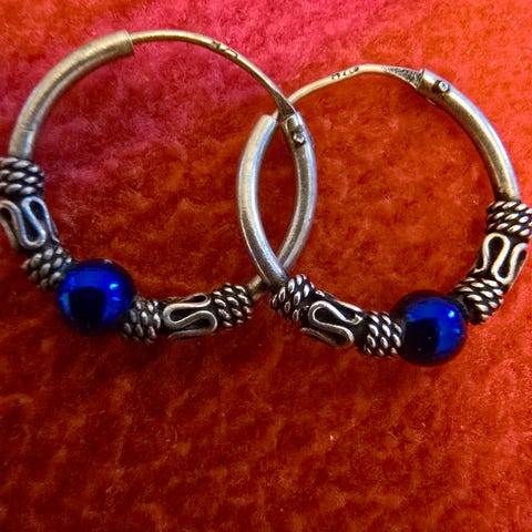 Hopeiset renkaan muotoiset korvakorut sinisellä timantilla. Uudenveroiset, ei ole käytetty montaa kertaa. Ostettu Kultajousesta.
