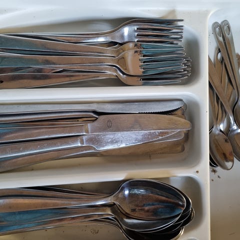 Aterimet ruostumattomia. Pakkaukset ehjiä mutta luonnollisesti kuluneita, aterimet siistit mutteivat kuitenkaan täysin käyttämättömät