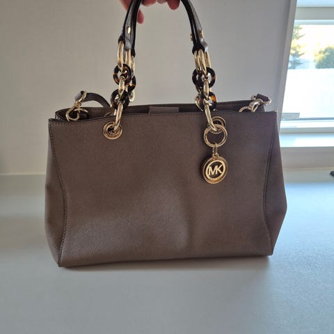 käyttämätön Michael Kors Cynthia laukku. Väri hiukan ruskeampi kuin pääkuvassa. Materiaali saffiano nahka. Ketjusomisteiset kantohihnat, irroitettava olkahihna, jossa säätömahdollisuus. Suljetaan laukun yläreunassa sisäpuolella olevalla pikku läpässä olevalla magneettinepparilla. Logokuvioitu harmahtavanbeige kangasvuori. Laukun sisällä keskellä vetoketjulla suljettava tasku. Toisella sisäreunalla vetoketjutasku ja sen sivulla kaksi avotaskua, toisella reunalla lisäksi kaksi avotaskua. Sisällä nauha esim. avainten kiinnitystä varten. Laukun pohjassa metallitassut. Mitat; leveys 30 cm, korkeus 22 cm, syvyys 13 cm.