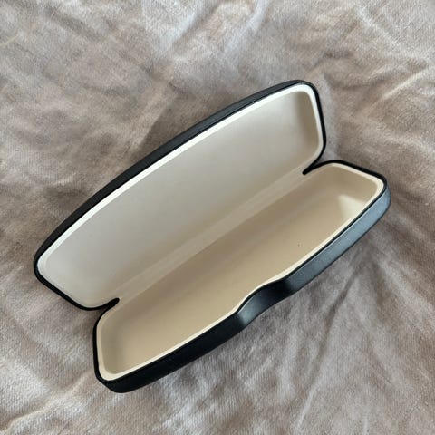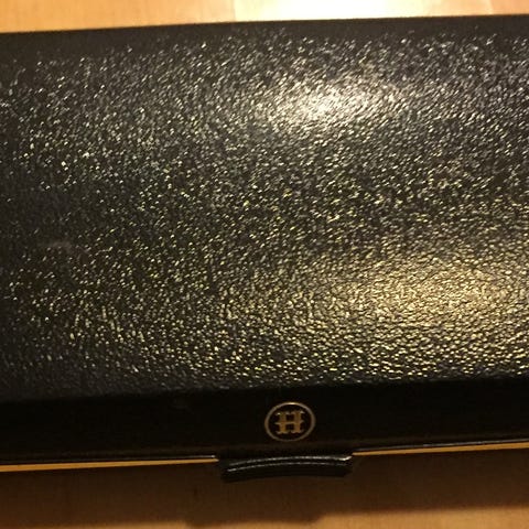 Silmälasikotelo, pituus 15,5 cm, korkeus n. 3 cm. Uudenveroinen. Postikulut pehmustamattomana kirjeenä 3,80 €.