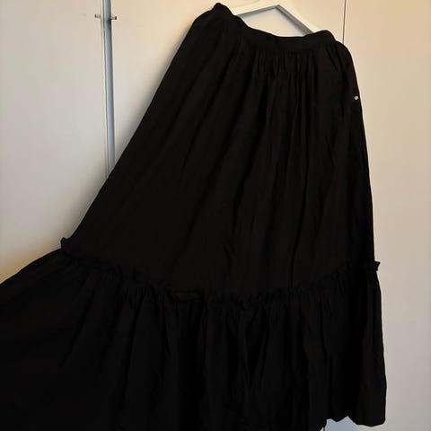 Upea naisten pitkä leveähelmainen vuoriton juhlahame/boho-hame ilman taskuja. Koko M. Rypistetty sekoitettu kangas. Joustava venyvä vyötärö. Voi pitää vyötäröllä tai lantiolla ja rypistyksen ansiosta menee koolle L. Ohut yläosa. Väri: musta. Hellävarainen pesu 30 asteessa. Uusi, käyttämätön. Ostohinta 120 euroa. Nouto tai postitus.