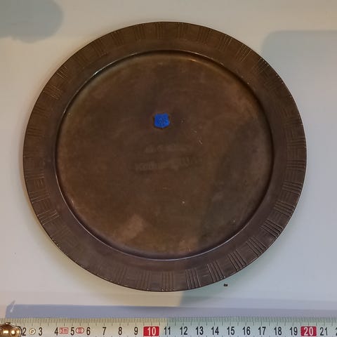Halkaisija 27 cm. Leimana ALP + leijonan kuva.