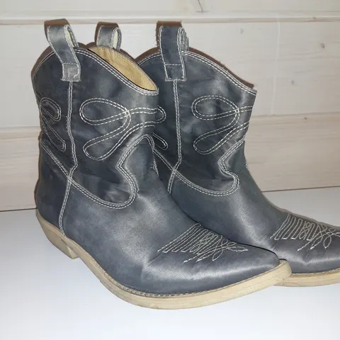 Harmaan väriset nilkkurit aitonahkaisena. Jääneet kaappiin, koska ovat sittenkin isot jalkaani. Vastaavat kokoaan ja sopivat parhaiten 38 koolle. Boots bootsit lyhytvartiset kengät. Pakettiautomaatti 8.90e