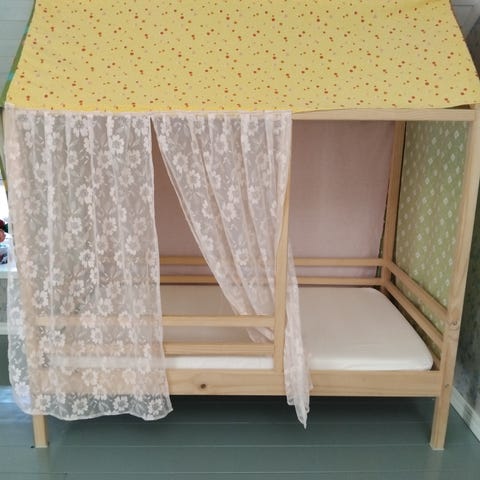 Erittäin hyväkuntoinen lastensänky, joka ollut yhden lapsen käytössä. Pituutta voi säätää noin 130-200cm välillä. Päädyssä lisäturvalaita PikkuPuskuri-pehmusteella. Kaikki pinnat ja pohja tosi hyvässä kunnossa, lukuunottamatta yhtä pientä koloa, joka näkyy kuvissa.