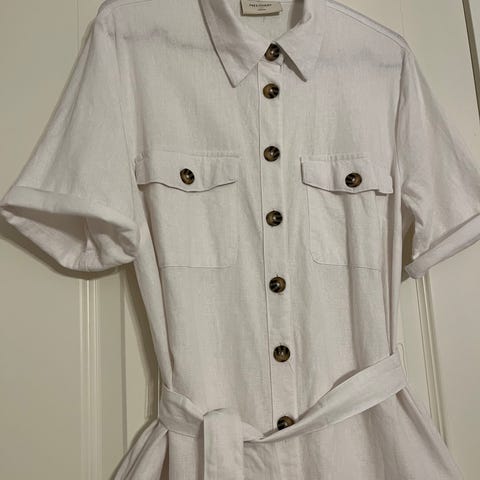 Mekko koossa L, kai-kai 58cm ja pituus niskasta helmaan 100cm. Suora malli. Kangasvyö kuuluu mekkoon. Ei sivutaskuja! Edessä napit. Materiaali 55% pellavaa ja 45% viskoosia. Ostettu Ranskasta. Hinta 75e