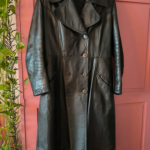 Kuvan mukainen vanha pitkä nahkatakki. Napituksen mukaisesti naisten malli,mutta mielestäni unisex. Kokona 46.
