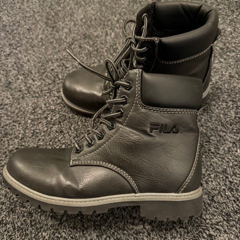 Mustat keinonahkapintaiset Filan kengät, keinonahassa sisäsyrjällä pientä kulumaa. Muuten ehjät ja ok kuntoiset.