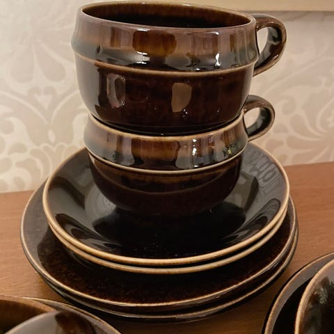 Arabia mahonki sarjan kolme ehjää kuppia ja yksi korvavikainen ja sokerikko. Sokerikon nupin saa liimaamalla huomaamattomaksi.