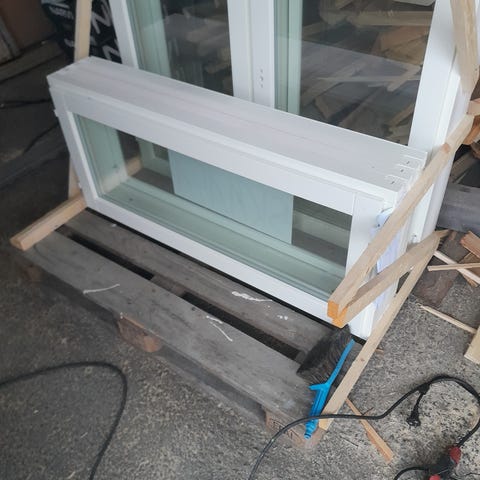 Pihlan uusi ikkuna sälekaihtimilla ja tuuletusikkunalla. Ulkopuolen värikoodi RAL 9006. Mitat 1390x1520mm.