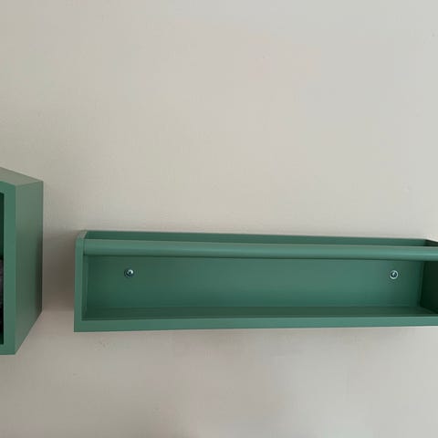Myydään uusia paketissa olevia vaaleanvihreitä seinähyllyjä. Sopii esim. lastenhuoneeseen.