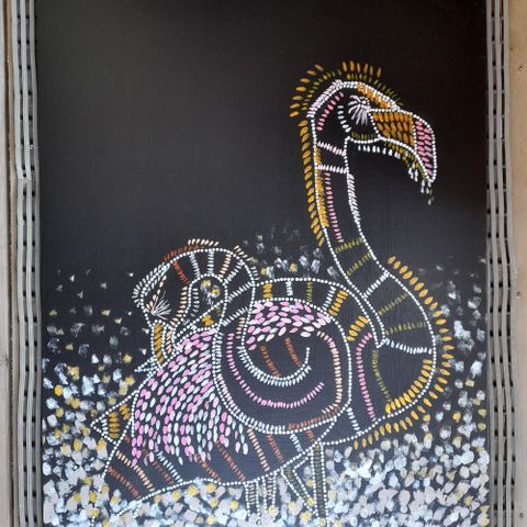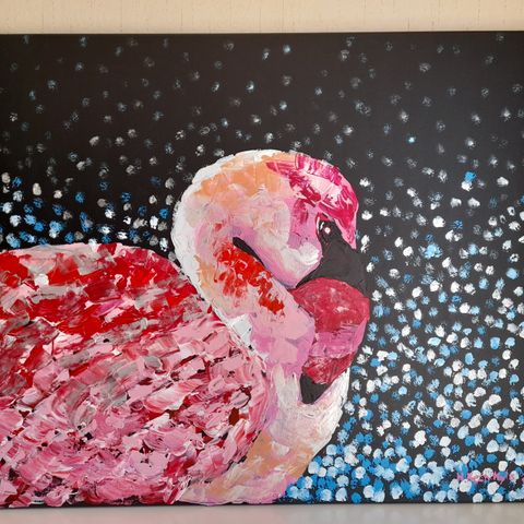 Andienflamingoja, 83x110 kokoinen (cm) akryylimaalaus maalauspohjalle (puukiiloihin kiristetty kangas), ei ole kehystetty. Saa laitettua seinälle sellaisenaankin ilman kehyksiä.