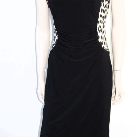 Kangas polyesteri sifonkia ja vuori elastista polyesteriä. Rinnan ympärys 90, helman pituus edestä 107 ja takaa 135.