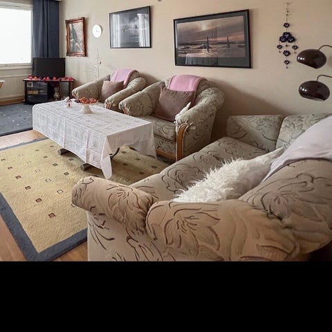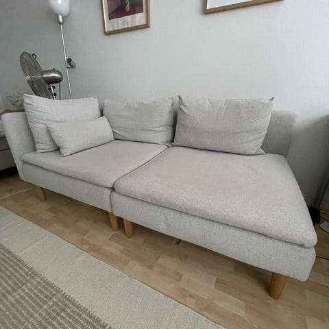 Erittäin hyvässä kunnossa oleva sohva, jossa kaksi erillistä osaa (saa myös kiinnitettyä yhteen). Rahi-osassa kaksi pientä palojälkeä (kuva 4), tulleet suoristusraudasta. Muuten ei minkäänlaisia käytön jälkiä, toiminut lähinnä sisustuselementtinä toisen sohvan rinnalla.