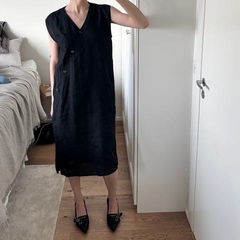 Pesulappu puuttuu mutta on siis puuvilla/pellava sekoite netistä löytämäni vastaavan myynnissä olleen perusteella, kokovuoraus, taskut, hieman pussitettu helma, kauniit "koristekivet" kauluksessa, 3 eri sävyä mekossa, vetoketju takana. Mallinukke 36/S (rinta 87/vyötärö 67), ei ihan mennyt kiinni vetoketju joten 34/XS kokoiselle.. Niska-helma 91cm, kai-kai 42cm. Käytetty siisti. Ei sovituksia, ei toridiiliä. Nouto tarkka aika etukäteen sovitusti ma-pe kl.10-16 hki88 tai postitse (matkahuolto/posti) pakettina.